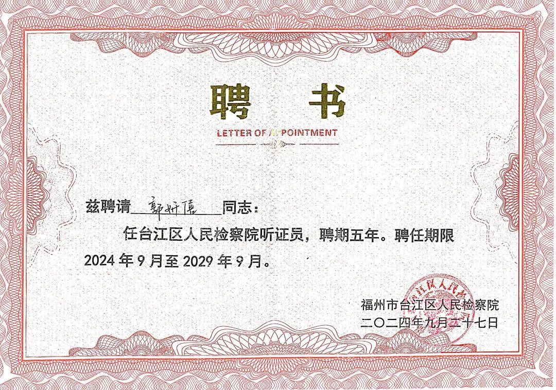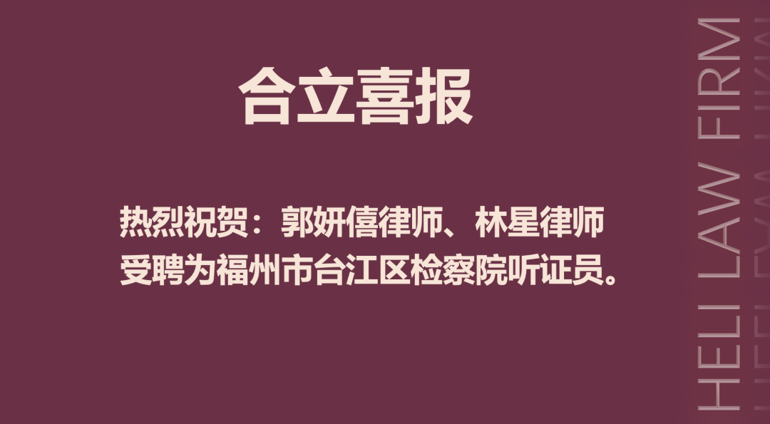 2024年9月27日,合立律所郭妍僖律师、林星律师受聘担任福州市台江区人民检察院听证员,聘期五年,聘任期限:2024年9月至2029年9月。作为听证员,郭妍僖律师及林星律师将参与重大案件的公正评议,确保司法公正和法律的严格执行,进一步推动司法透明与公正。