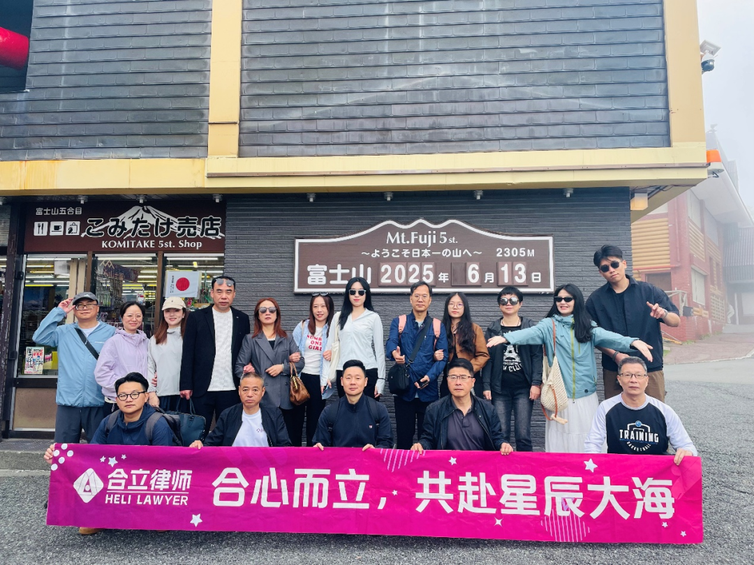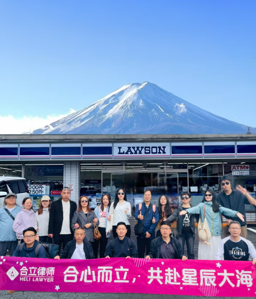 在富士山五合目(2305M)的观景台上,"合立律师 HELI LAWYER"的旗帜与雪山同框。背景中"ようこそ日本一の山へ"(欢迎来到日本第一高山)的标语与团队"合心而立,共赴星辰大海"的理念遥相呼应。这张照片定格了团队在云海之上的集体宣誓——以如山般沉稳的专业根基,攀登服务新高度。