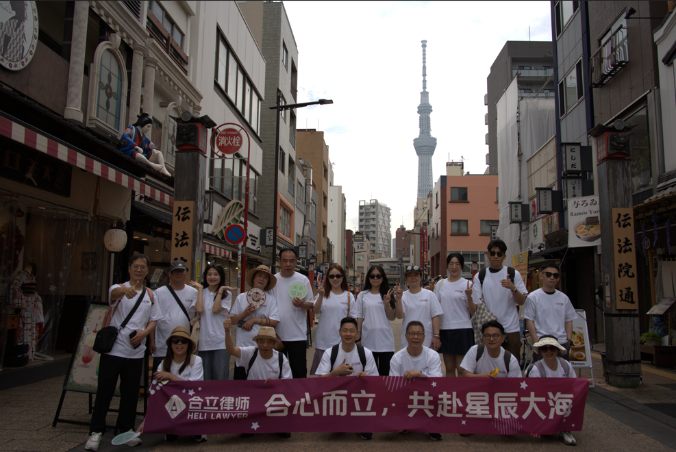 照片中,团队将律所英文名"HELI LAWYER"与日式书法"任法 方万为"巧妙同框。背景里若隐若现的"任法院通"字样,恰似法律人在异国文化中探寻法治本源的隐喻。这张中西合璧的创意合影,展现了专业与文化的交融之美。